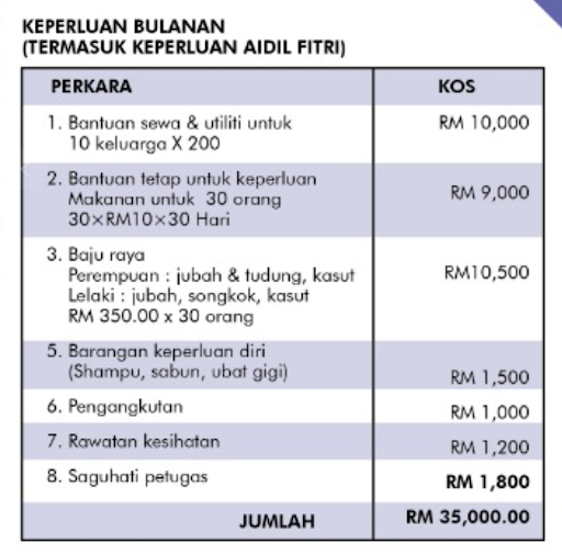 Kami juga memerlukan bantuan dan sokongan anda semua untuk membantu menampung kos operasi kami seperti perbelanjaan bulanan dalam menjalankan bantuan kepada para penerima yang merangkumi biil api, air, sewaan rumah, makanan, bahan basah, keperluan rumah, saguhati petugas serta banyak lagi bentuk bantuan yang selayaknya diterima oleh golongan asnaf ini.